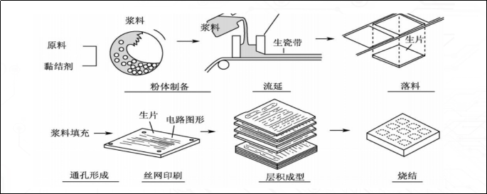 低溫共燒多層陶瓷(LTCC)是以陶瓷作為電路基板材料,利用無機(jī)陶瓷粉加上有機(jī)黏結(jié)劑混合成泥狀的漿料,經(jīng)過刮刀成型干燥后制成一張張的薄生胚,再利用網(wǎng)版印刷技術(shù)將電路印在上面,于各層打出上萬個通孔,內(nèi)外電極可分別使用銀、金等金屬,在攝氏850-900多度的燒結(jié)爐中,以平行式印刷涂布制程燒結(jié)形成整合式陶瓷組件。